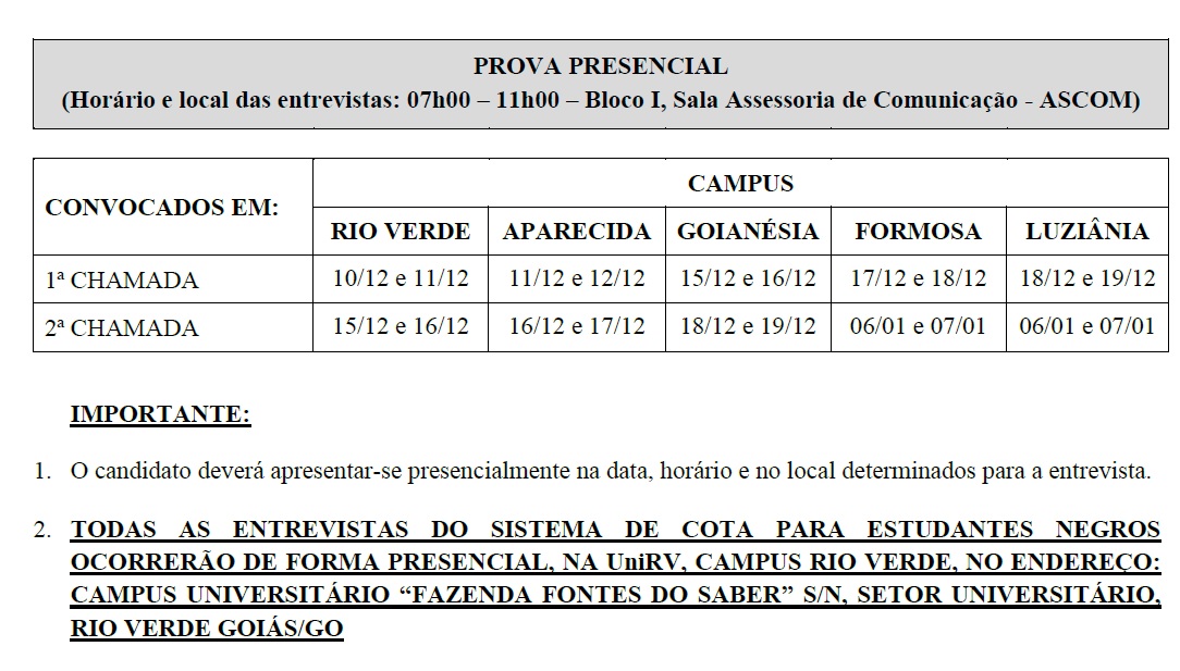 DATA E HORÁRIO DE ENTREVISTA PARA CANDIDATOS DA COTA DE ESTUDANTES NEGROS (LOCAL: RIO VERDE - GO)