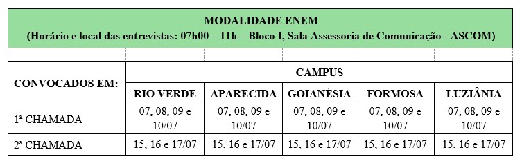 O candidato convocado para matrícula pertencentes à ampla concorrência (sistema universal), ao sistema de cota para estudantes de escola pública e ao sistema de cotas para índios ou pessoas com deficiência, deverá, no dia e horário designado para matrícula, comparecer presencialmente em um dos seguintes Campus da UniRV (a ser escolhido pelo candidato): Campus Aparecida Extensão Goiânia, Campus Formosa, Campus Goianésia, Campus Luziânia ou Campus Rio Verde